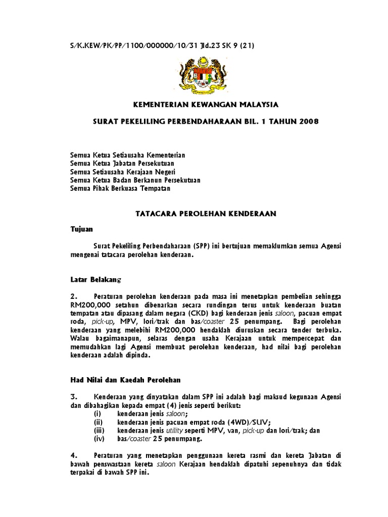 Pekeliling Perbendaharaan Bil 1 2008 Perolehan Kenderaan Pdf